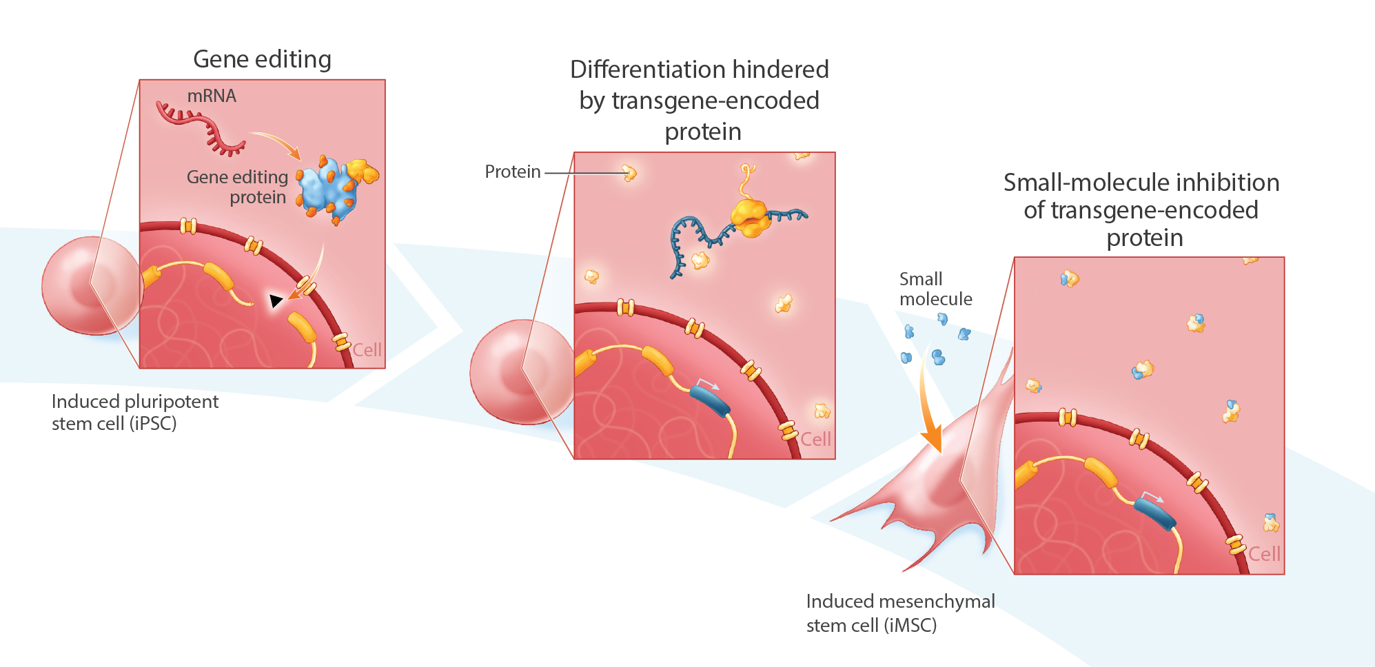 Indoleamine 2,3-dioxygenase 1 (IDO1) is an inducible, heme-containing enzyme that is critically involved in tryptophan catabolism and known to be a prominent immune regulator. Cell therapies with increased IDO1 expression are of high interest for a variety of indications, including autoimmune disorders, inflammatory diseases, transplant recovery, and wound healing. In particular, iPSC-derived mesenchymal stem cells (iIMSCs) engineered to overexpress 1DO1 may be ideal for suppressing dysregulated immune cells while simultaneously promoting expansion of regulatory I' lymphocytes and the M1 (pro- inflammatory) to M2 (anti-inflammatory) polarization of macrophages. Here, we report the development of an iMSC cell line containing an IDOI transgene under the control of a Jel’ promoter that was inserted into the AAVS] safe-harbor locus in mRNA-reprogrammed iPSCs. A clonal population of edited cells (i.e. IDO1-1PSCs) was isolated using single-cell sorting. Bi-allelic insertion of the IDOI transgene was confirmed by amplicon sequencing. The 1DO1-1PSCs were then differentiated to IDO1-iMSCs. During differentiation, we found that the 1DO1-iPSCs showed an unexpected, cuboidal morphology and noticeably decreased proliferation rates relative to control iPSCs, possibly indicating that IDO1 was interfering with the differentiation process. 1'wo small-molecule IDO] inhibitors, Epacadostat, which binds to holo (heme-bound) IDOI and inhibits the enzymatic function of the protein, and IDO1-IN-5, which binds to apo (heme-dissociated) 1DO1 and inhibits [DO1-dependent cell signaling, were added to the culture for the final five days of differentiation. The addition of both IDO! inhibitors (each at a 10uM concentration) increased the proliferation of the partly differentiated IDO1-iPSCs (6 h reduction in doubling time) with a population doubling time approaching that of control iMSCs (29 h vs. 27 h). While both inhibitors could enhance proliferation independently, Epacadostat alone had a larger effect on population doubling time than the IDO1-IN-5 alone (6h vs. 2h reduction in doubling time), suggesting that the anti-inflammatory enzymatic function of IDO1 may be most responsible for decreased proliferation during differentiation of IDO1-iPSCs. Notably, we also found that when administering both IDO1 inhibitors to non-engineered control iMSCs, the population doubling time increased relative to untreated test cultures (34 h versus 27 h), suggesting a possible minimum IDO1 protein level required for optimal iMSC culture. These results suggest that small-molecule inhibition of transgene-encoded proteins may form a key element of directed differentiation process development for knock-in iP$ cell lines, and may be useful for the scale-up manufacturing of IDO1-iMSCs in particular.